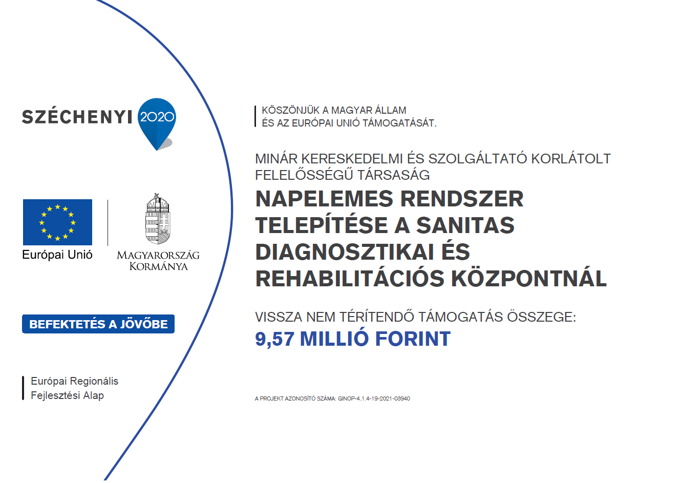 - a projekt címe: Napelemes rendszer telepítése a Sanitas Diagnosztikai és Rehabilitációs Központnál